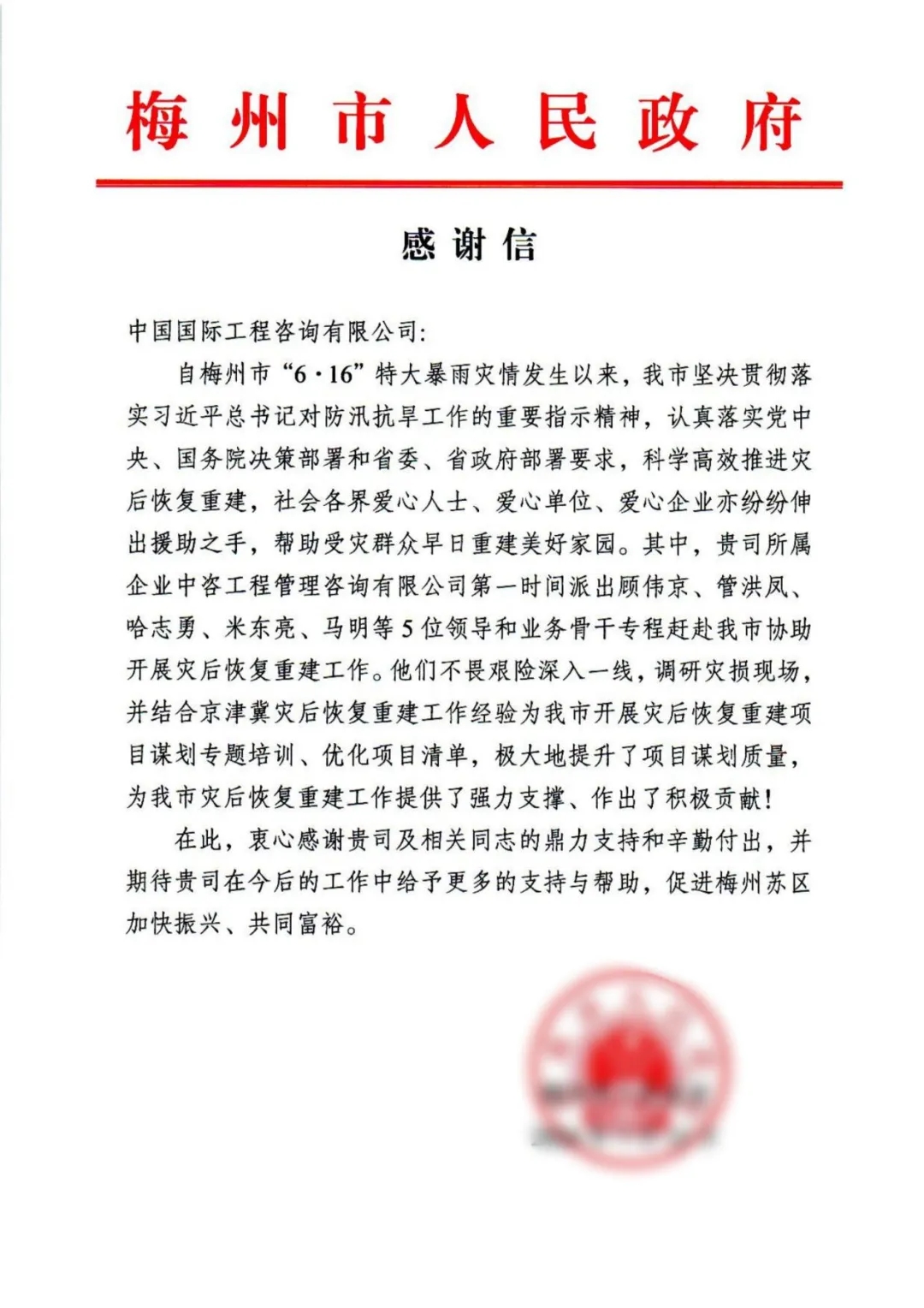 近期,一封來(lái)自梅州市政府的感謝信翩然而至,表達(dá)了災(zāi)區(qū)人民對(duì)中咨管理公司的衷心感謝。