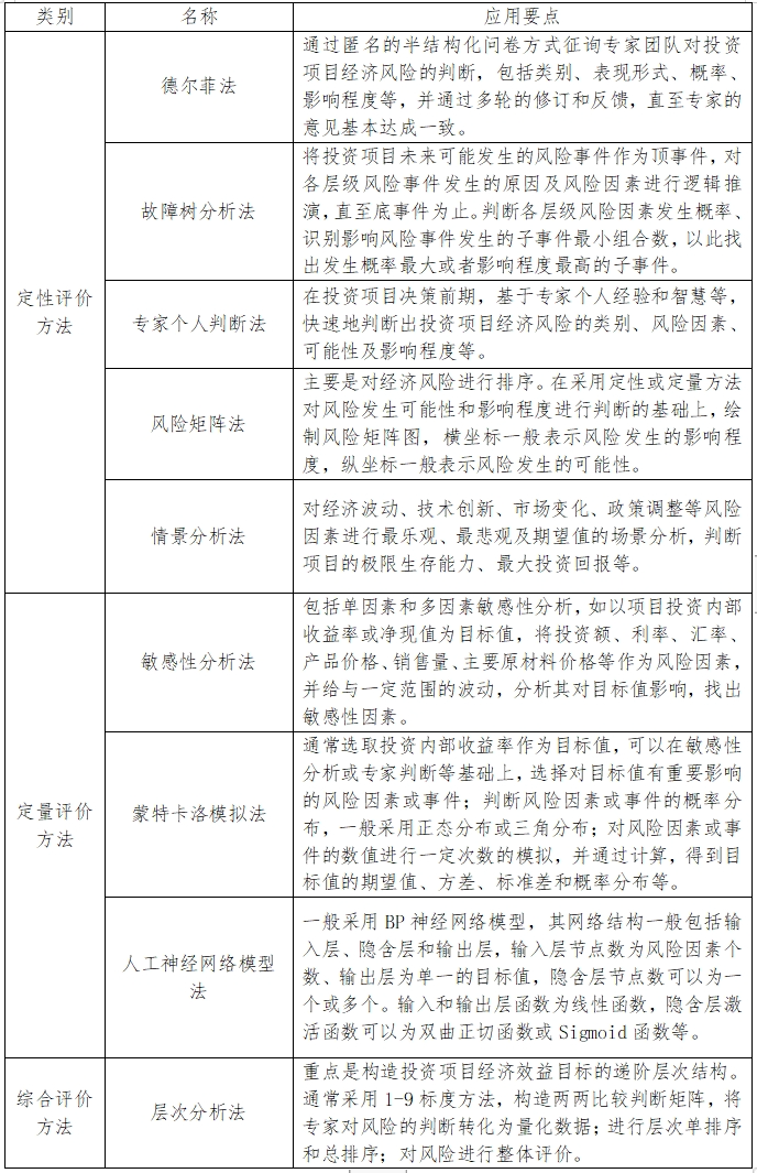 表1 投資項(xiàng)目經(jīng)濟(jì)風(fēng)險(xiǎn)分析評(píng)價(jià)常用方法應(yīng)用要點(diǎn)