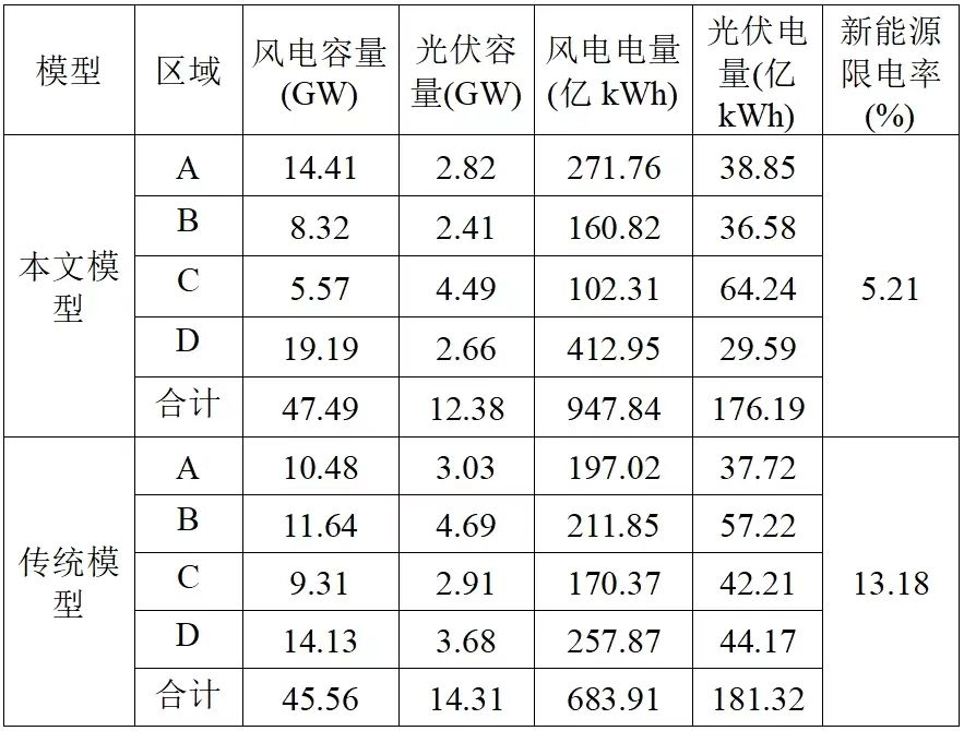 可以看出,對比傳統(tǒng)方法,考慮源-荷匹配后,本文模型所得D地區(qū)風(fēng)電和C地區(qū)光伏最優(yōu)布局容量分別增長了35.81%和54.3%。從風(fēng)電和光伏總裝機方面看,本文模型所得風(fēng)電總?cè)萘枯^傳統(tǒng)方法高4.24%,這表明考慮源-荷匹配后,系統(tǒng)更傾向于配置互補性更好的風(fēng)電,光伏由于出力形狀較為固定,容量越大越難以實現(xiàn)源-荷匹配。此外,在新能源總裝機一致的情況下,本文模型得到的新能源年度總出力電量為1124.03億kWh,而傳統(tǒng)模型所得新能源年度總出力電量為865.23億kWh,前者相較后者提升29.91%,即考慮源-荷匹配可使新能源滲透率從28.51%增加至37.04%。從新能源限電方面看,考慮源-荷匹配可使新能源總限電率從傳統(tǒng)模型的23.18%降低至本文模型的5.21%??梢钥闯?,在同樣的裝機總?cè)萘肯拢紤]源-荷匹配可以充分提升新能源消納能力,減少棄風(fēng)、棄光情況。