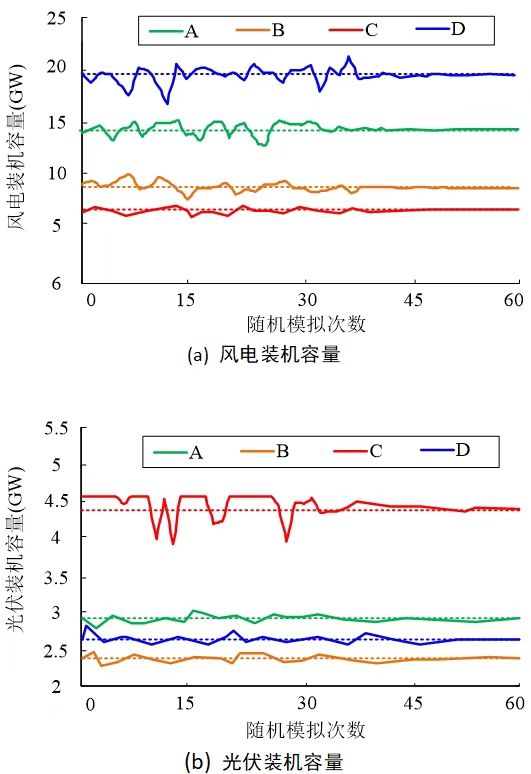 圖8中虛線為各指標(biāo)期望值,可以看出,各地區(qū)風(fēng)電裝機容量波動范圍分別為14.1-14.9GW、7.9-8.7GW、5.2-5.8GW、17.3-20.8GW,光伏裝機容量波動范圍分別為2.6-3GW、2.3-2.5GW、3.9-4.6GW、2.5-2.8GW??梢钥闯?,單次規(guī)劃結(jié)果具有一定隨機性,多組規(guī)劃結(jié)果期望值可靠性更高,所得規(guī)劃結(jié)果在60組場景下均收斂于期望值。