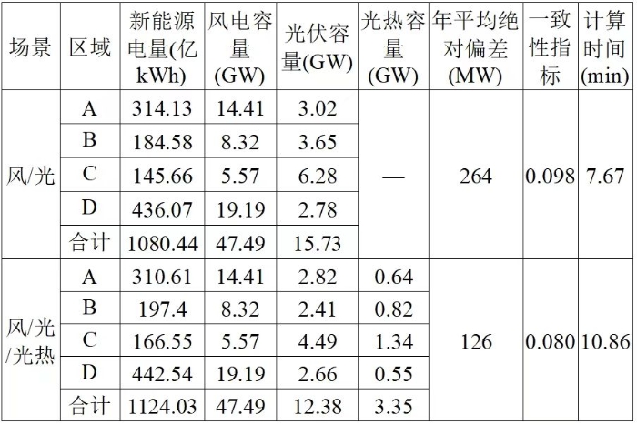 為了研究靈活性新能源電源接入系統(tǒng)對多區(qū)域新能源優(yōu)化規(guī)劃布局的影響,本節(jié)設(shè)置風(fēng)/光組合和風(fēng)/光/光熱組合兩類場景,分別計算兩類場景下的多能源電力系統(tǒng)容量規(guī)劃結(jié)果。令風(fēng)/光組合光伏裝機容量與風(fēng)/光/光熱組合光伏與光熱總裝機容量相等。其余約束條件和計算邊界均一致。計算結(jié)果如表3所示。