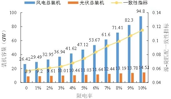 為了研究新能源限電率對多區(qū)域新能源優(yōu)化規(guī)劃布局和源-荷匹配效果的影響,本節(jié)給定CSP電站發(fā)電容量為3.35GW、系統(tǒng)最大新能源限電率由0增加至10%時,計算風(fēng)、光最優(yōu)接入容量和源-荷匹配一致性指標(biāo)的情況,結(jié)果如圖6所示。
