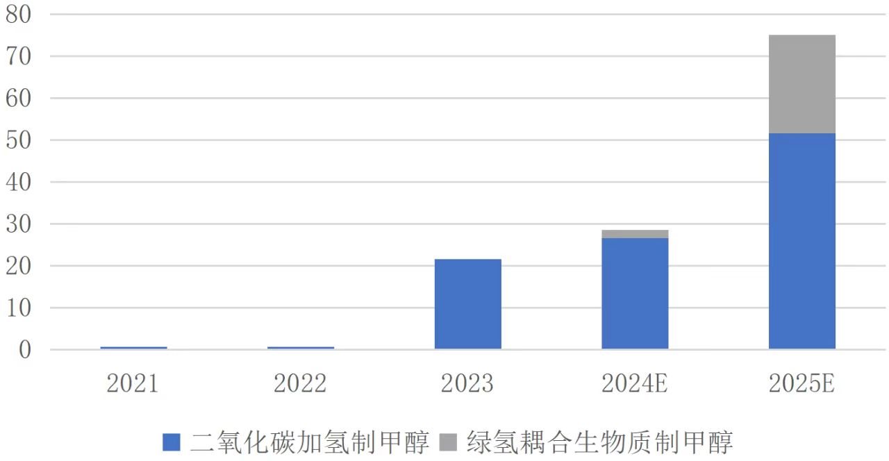 注:本圖未統(tǒng)計綠氫耦合煤化工制甲醇項目及未耦合綠氫的生物質(zhì)制甲醇項目;二氧化碳加氫制甲醇的碳源主要指工業(yè)尾氣碳捕集來源的二氧化碳,包含生物質(zhì)電廠尾氣,氫氣來源包括綠氫及工業(yè)副產(chǎn)氫。