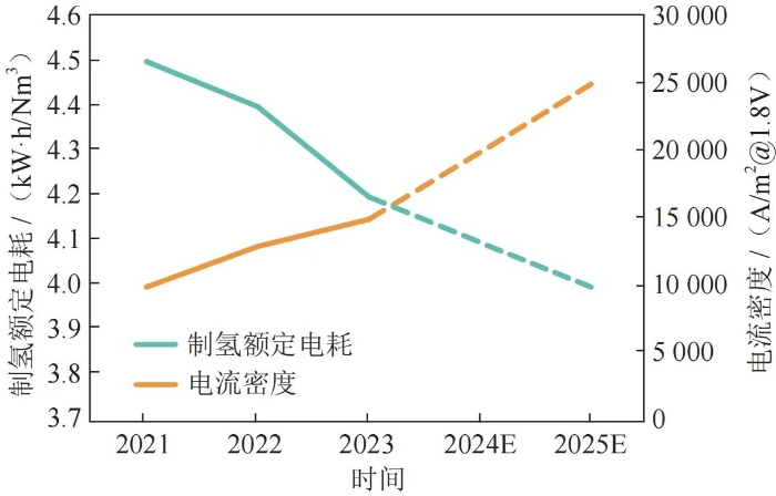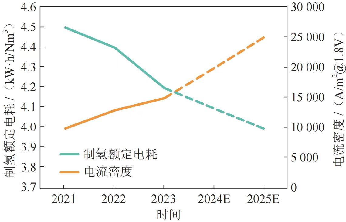 圖2 2021-2025年中國堿性電解槽制氫電耗及電流密度發(fā)展趨勢